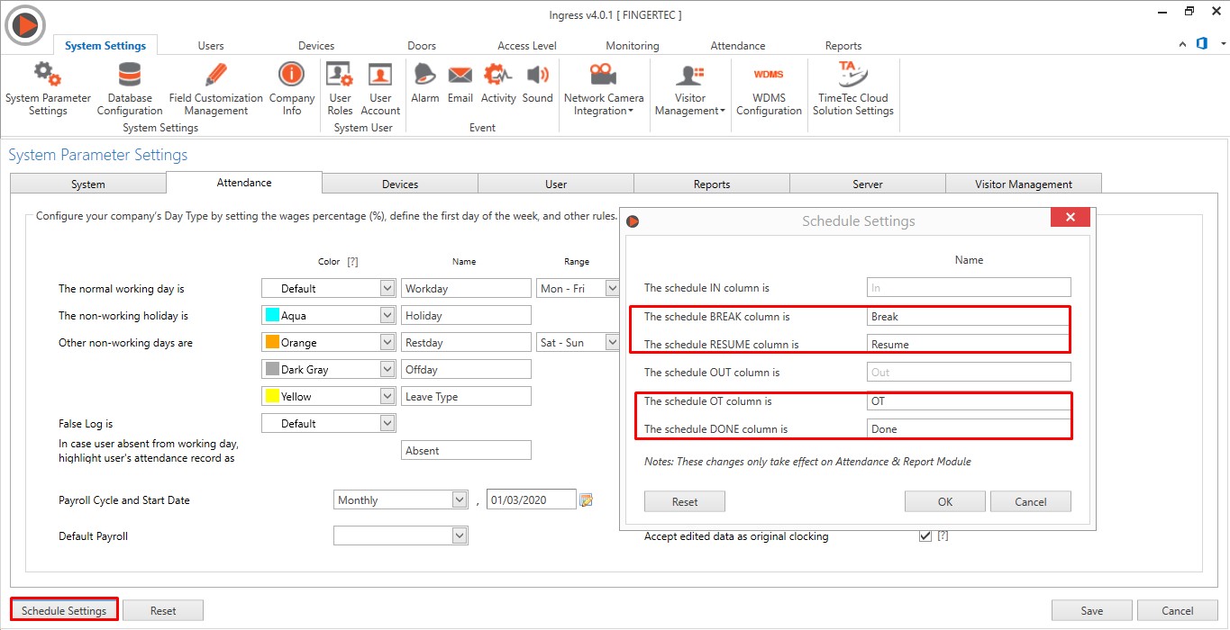2. Added the option to modify the name of Break, Resume, OT, Done in the System Settings