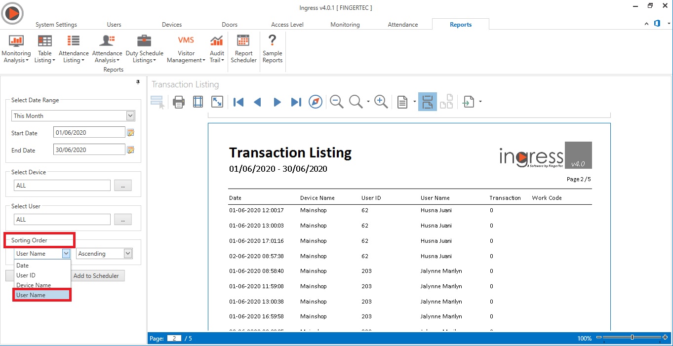 4. Added the Username in the Sorting Order Selection for Transaction Listing Report