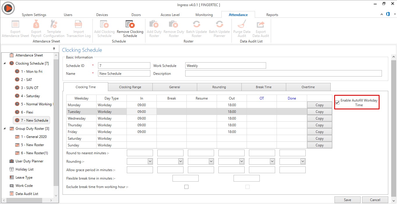7. Added the Autofill option for schedule. When the users insert the clocking time, the system will fill in automatically the other workday clocking time fields that are being left empty.