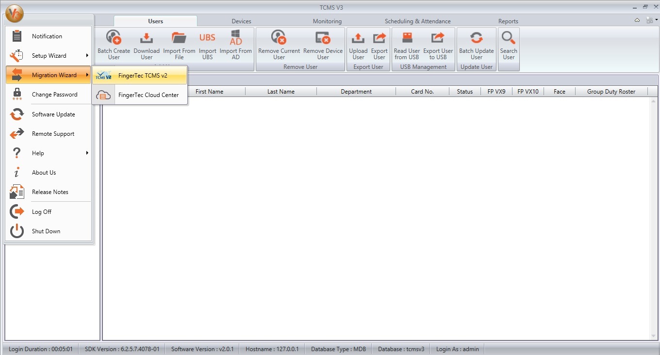2) Now, go to the TCMS V3 software > Click v3 icon > Migration Wizard > FingerTec TCMSv2.
