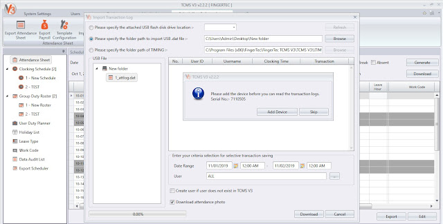 14. Enhanced import transaction log from USB file by provide option to add new device into system